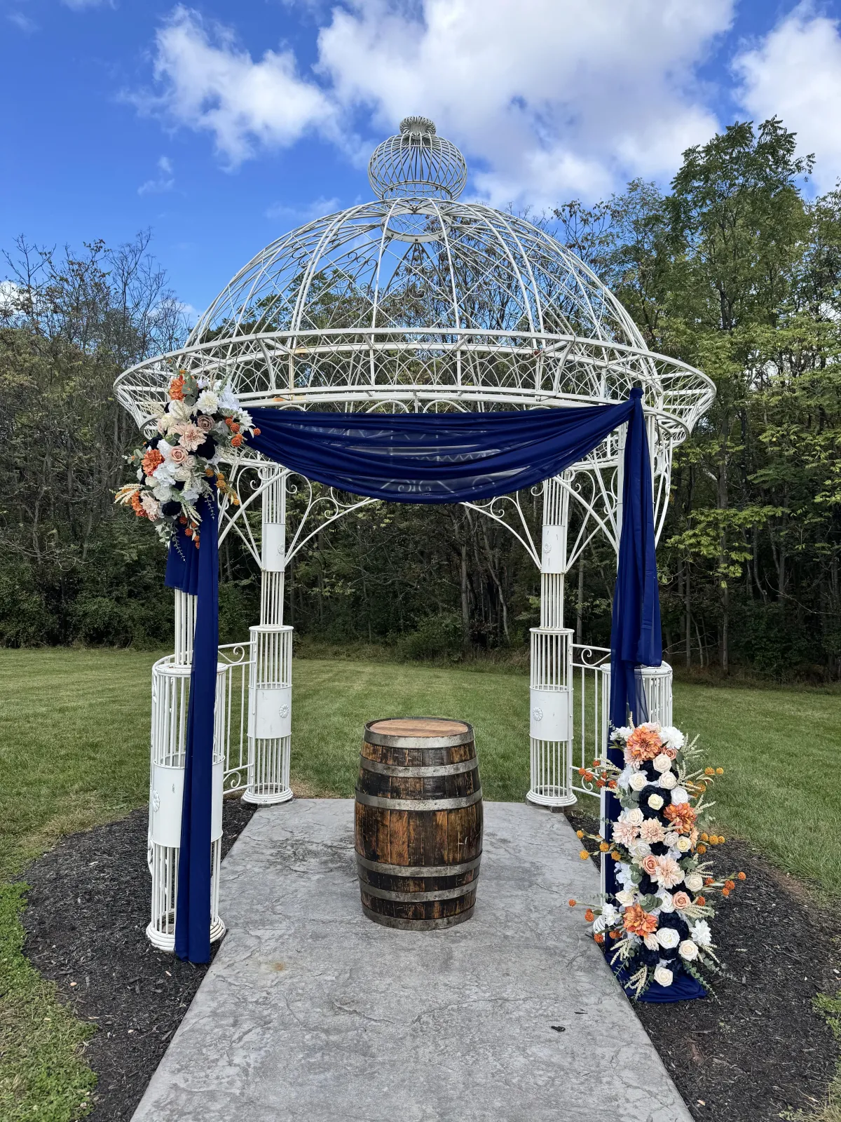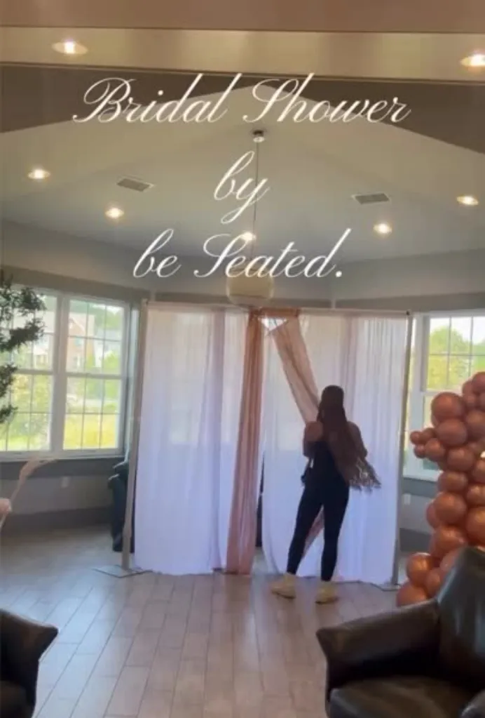 Statement backdrop setup. Featuring a simple but elegant drape or arch backdrop and soft faux florals or balloons this creates the perfect photo opp. Whether they're posing for pictures or opening gifts, they're sure to feel celebrated.— perfect for intimate gatherings that still feel special.